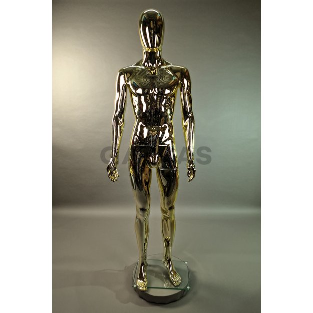 Pełnowymiarowy manekin męski do sprzedaży odzieży. Bardzo przyjemny, „miękki, nie drażniący dla oczu” kolor naturalnego złota. Bez twarzy. Głowa manekina obraca się o 360 stopni. Mocowanie głowy - z uchwytem magnetycznym. Wykonany z ekologicznego tworzywa ABS. W zestawie szklana podstawka i uchwyt (z funkcją zakładania butów na manekina)