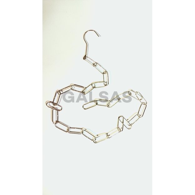 Metalowy chromowany haczyk łańcuszkowy z haczykiem na jednym końcu. Do wieszania ubrań, wyrobów pończoszniczych itp. Długość 1,05 m, średnica 1,8 mm. Łańcuchy pozwalają na maksymalne wykorzystanie przestrzeni do wieszania ubrań lub innych towarów. Wygodny w użyciu w namiotach handlowych, pawilonach handlowych lub innych punktach sprzedaży z rurowym, "siatkowym", podobnym wyposażeniem handlowym.