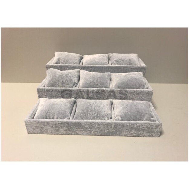 Trzypoziomowe pudełko na bransoletki, zegarki. Szary welur. Wyjmowane poduszki. Rozmiar: 25 x 25 cm